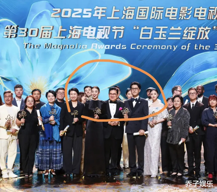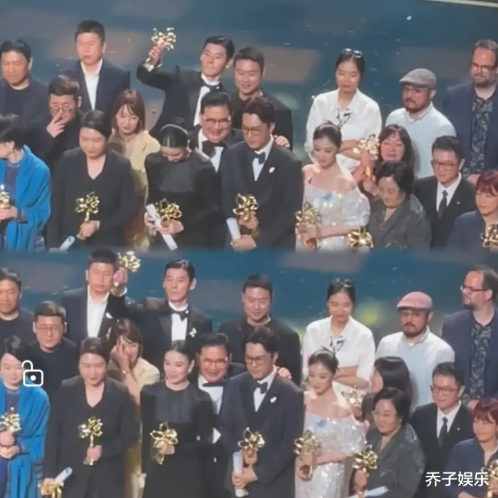 更让人心酸的是蒋明奇,这位最佳男配得主全程被挤在最后面那排,举奖杯时还怕挡住他人,合影里只能露个头。